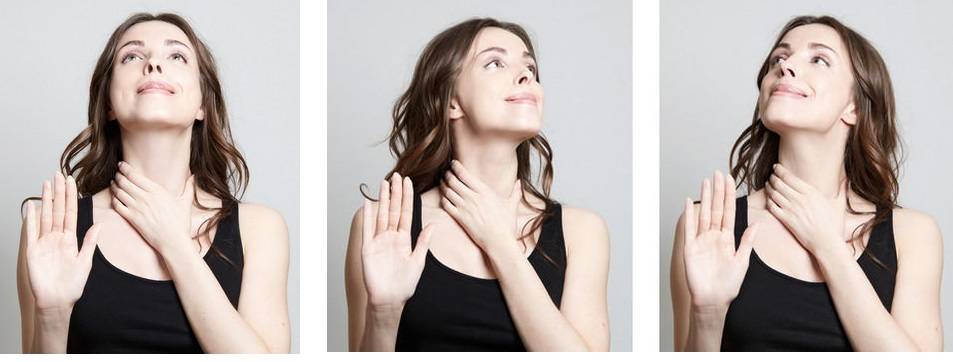 - Положить руку на основание шеи, направить подбородок вверх, прикоснуться языком к верхней губе, поворачивать голову то в одну, то в другую сторону,