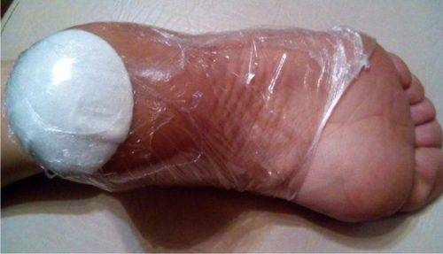 Смоченную в растворе марлю или диск из ваты прикладывают к пятке, фиксируют лейкопластырем. На ноги надевают полиэтиленовые бахилы.