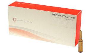 - Дермастабилон – липолитический инъекционный препарат на основе фосфатидилхолина. Действие заключается в трансформации расщепленного жира в эмульсию. Колоть препарат потребуется не менее 7 раз с перерывом в 10 дней.