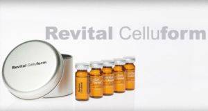 - Ревитал Целлюформ (Revital celluform) – эффективный коктейль из фосфатидилхолина, аминокислот, никотиновой кислоты, витаминов и вытяжки арники. Основным плюсом препарата является эффект омоложения и жиросжигания. Курс липолитика содержит 5 процедур, которые следует повторять 1 раз в полгода, чтобы не допустить локального образования жировых отложений.