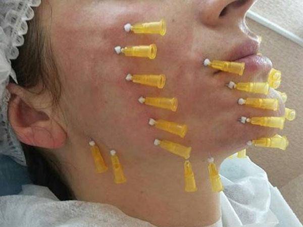 - Обязательно используется анестезия, введение игольчатых нитей вызывает болезненные ощущения. Зачастую применения крема недостаточно, обезболивающий препарат вводится с помощью инъекции 0.5 мл лидокаина или 2% ультракаина.