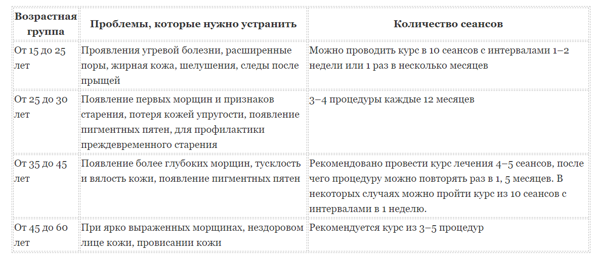 Процедуру делают у косметолога 1 раз в 2 недели для жирной и грубой кожи лица и раз в месяц — для сухой.