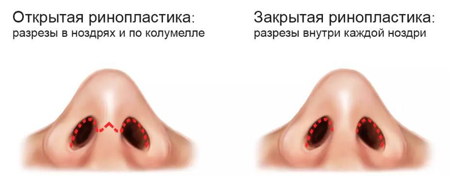 При открытой ринопластике носа, хирург производит надрез тканей носа, что позволяет ему получить полный обзор. Этот способ более травматичен, чем при закрытой ринопластике, однако, при устранении серьезных патологий, или врожденных дефектов ему нет равных.