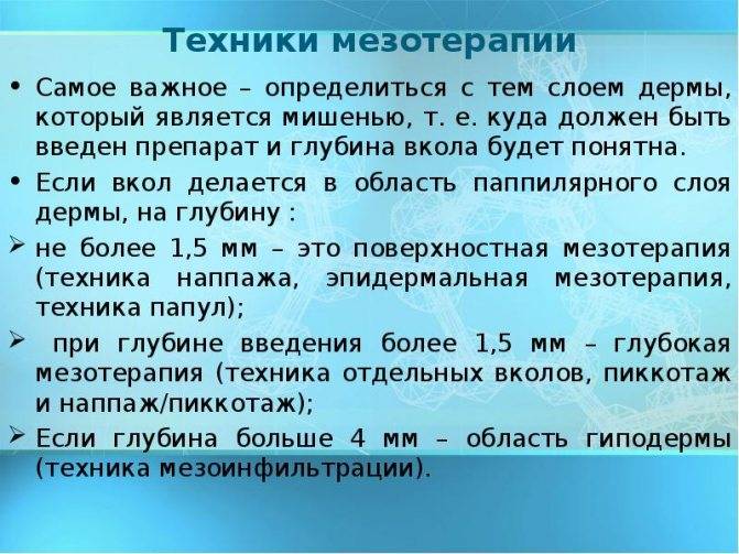 С помощью очень тонких и коротких игл в нужной области под кожу на глубину от полутора до 6 мм вводятся микродозы специального коктейля из различных препаратов.