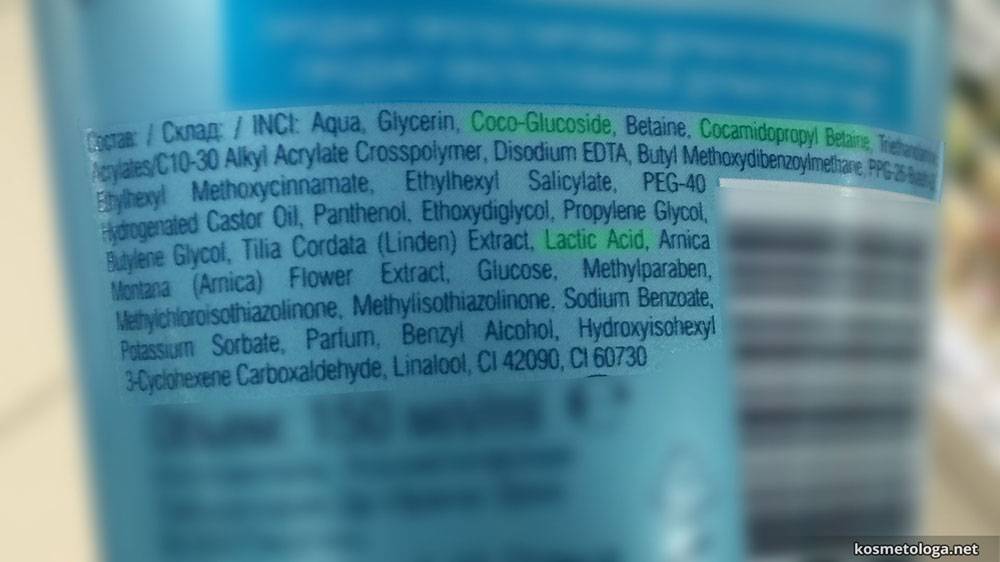 В составе отсутствуют лаурил и лаурет сульфаты, а присутствуют мягкие очищающие вещества — Кокамидопропил бетаин (Cocamidopropyl Betaine) и молочная кислота — Lactic Acid, что очень хорошо для комбинированной кожи и жирной кожи.