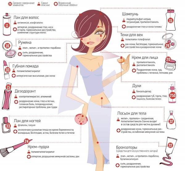 В самых безобидных случаях просто ухудшится состояние кожи. Могут возникнуть угревые высыпания, акне, нарушения работы сальных желез и т.д. Химические вещества содержатся в составе косметики. Они могут увеличить вероятность появления рака, поэтому лучше не проверять это на себе.