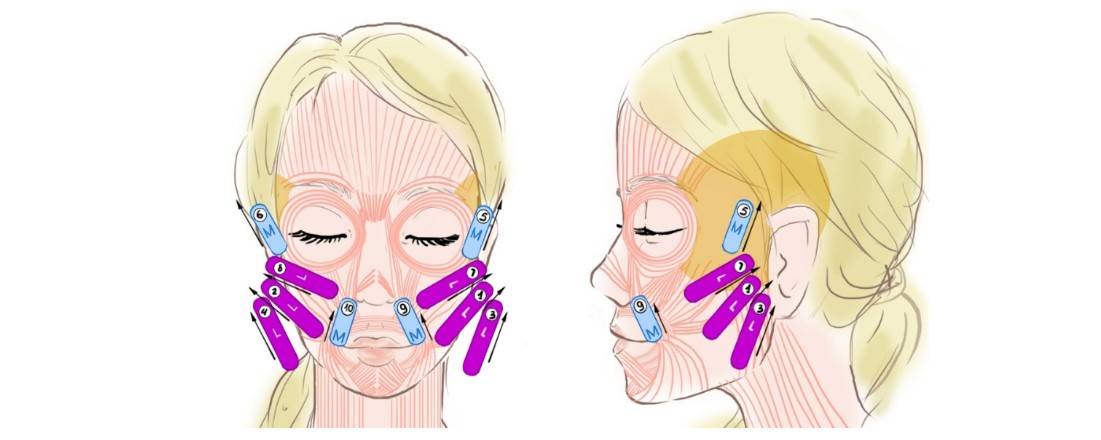 Схемы нанесения лент зависят от того, какую проблему нужно решить: избавиться от отеков, разгладить морщины, подтянуть контур лица, снять боль.