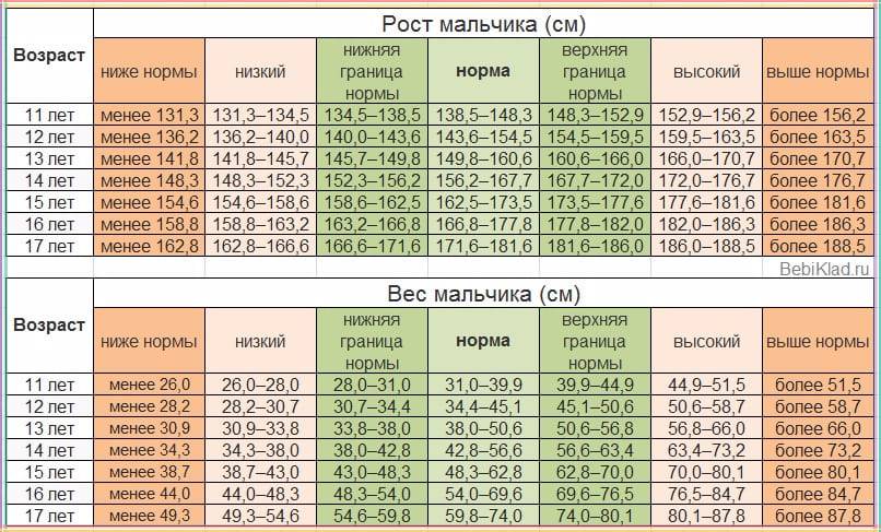 Таблица роста и веса подростков мужского пола. Показатели роста и веса в таблице выражены в сантиметрах и килограммах.
