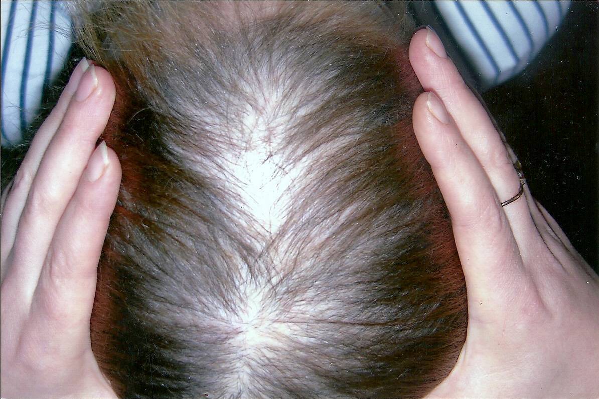 Волосы на темени у женщины теряют цвет, становятся более блеклыми, заметно истончаются, в результате чего обламываются. Часто на фоне облысения возникает сопутствующее заболевание – себорейный дерматит, которое выражается следующими симптомами: перхоть, засаливание волос, появление угрей на коже головы и лобной области.